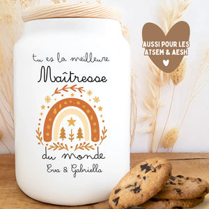 Parce que les maîtresses, les ATSEM et les AESH méritent une attention particulière à Noël, offrez-leur un présent utile, beau et chargé de sens. Ce pot à cookie personnalisé, fabriqué avec soin dans notre atelier en France, permet d’associer gourmandise, décoration et reconnaissance dans un seul objet.
