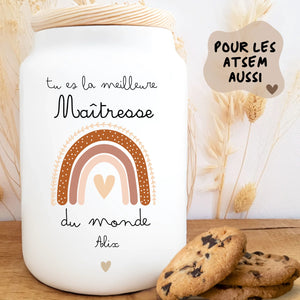 Avec ce pot à biscuit ATSEM ou maîtresse, vous offrez une délicate attention remplie de gourmandise. Ajoutez un message tendre, un prénom ou une illustration amusante. Ainsi, chaque pot devient un souvenir chaleureux qui sera utilisé avec plaisir au quotidien.